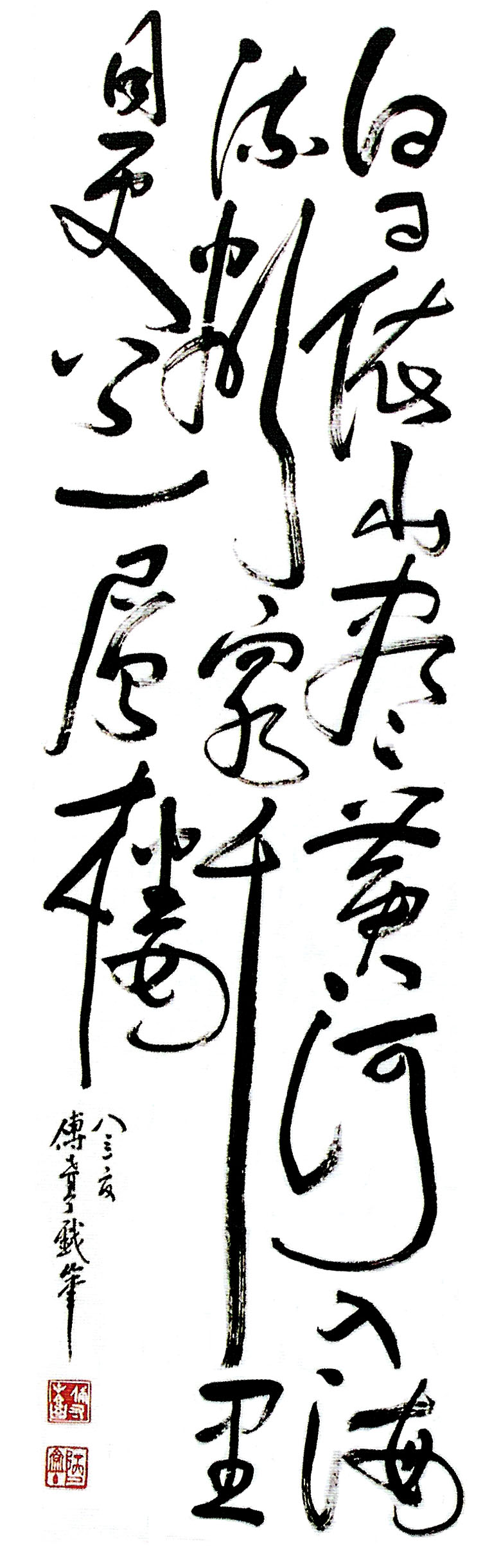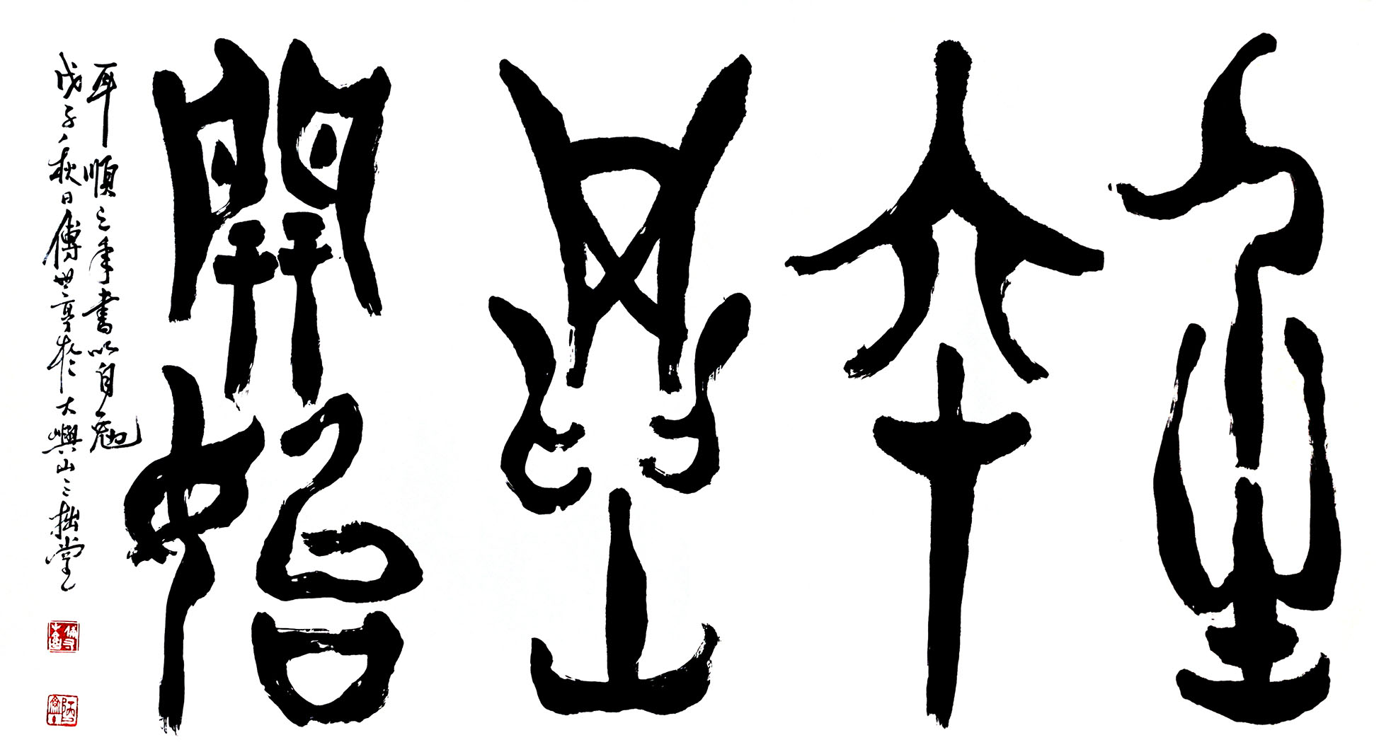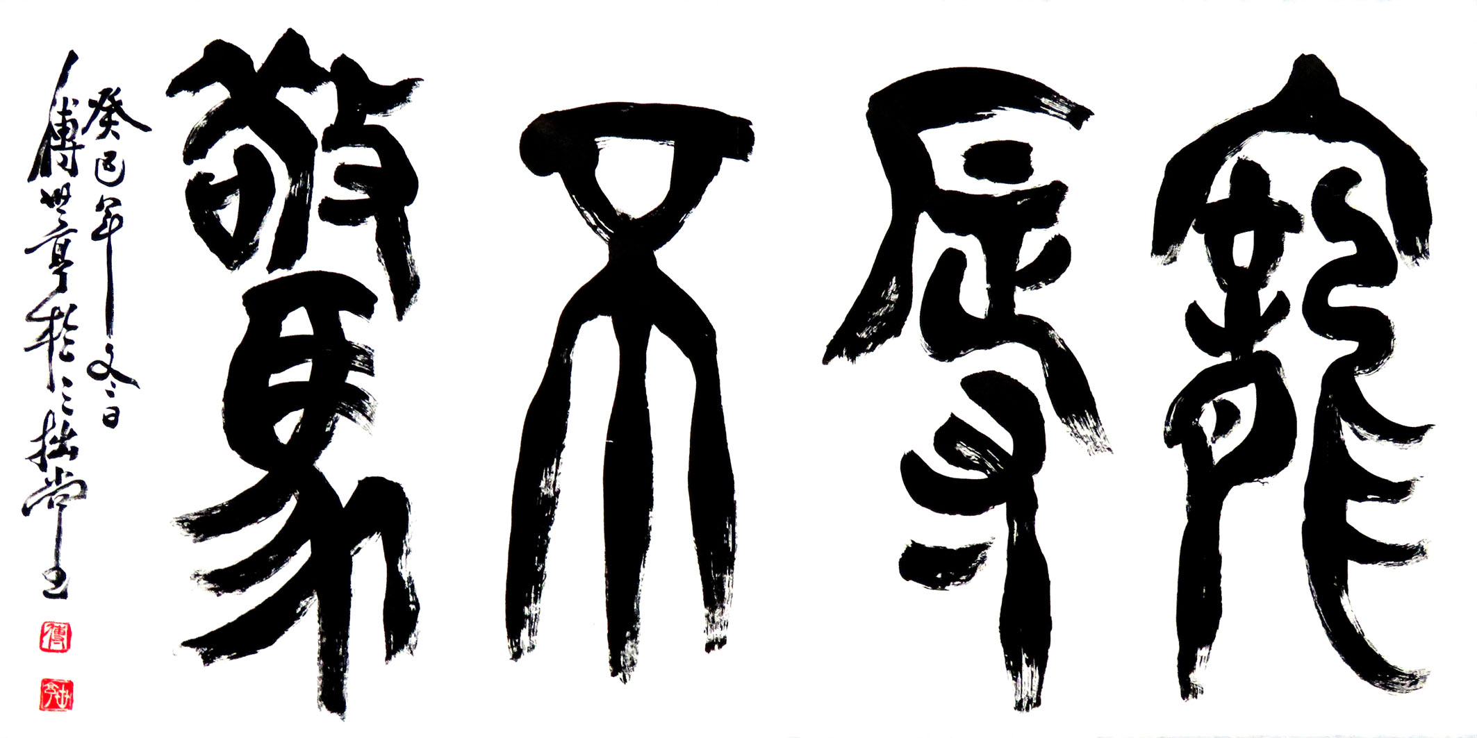傅君書法擅長篆、隸、行、草,曾習大篆甲骨文、金文及鐘鼎文,隸書曾習禮器、曹全、張遷及石 門頌等碑,行書喜好米芾、黃山谷、王鐸、傅山等名家。創作書法時常以不同書體組合在一起,有 篆、隸合體,有篆、行合體,清朝鄭板橋已成功應用此手法書寫作品。傅君的篆書別具一格,多以 象形化的造形來表達字形結構,同時運用有輕重粗幼線條來書寫,與傳統篆書純用中鋒筆書寫每條 線條粗幼一樣,比較自由揮灑及隨意變化,從其篆書作品,可以觀察到一種寫意化的行筆表達方式。 |