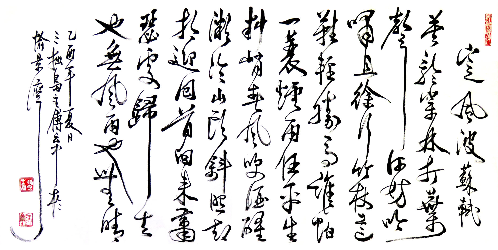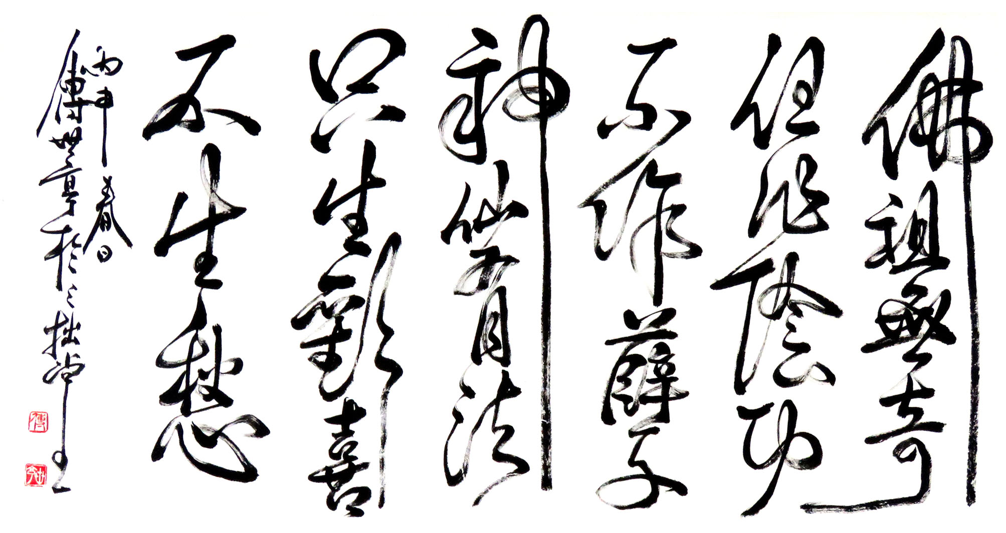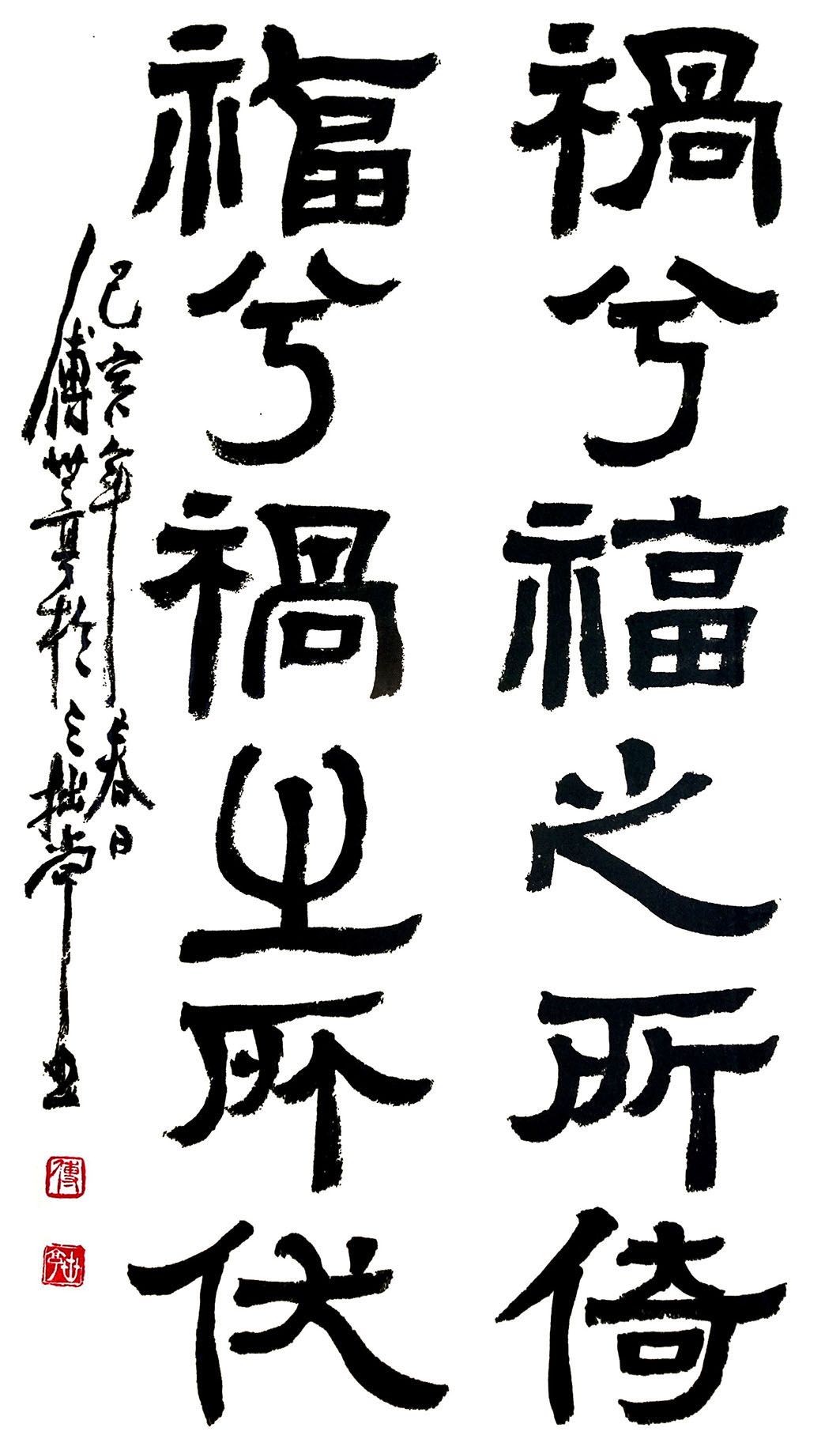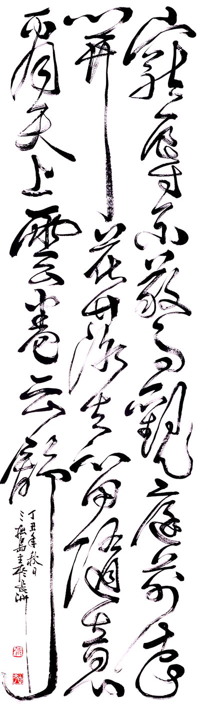 傅君書法擅長篆、隸、行、草,曾習大篆甲骨文、金文及鐘鼎文,隸書曾習禮器、曹全、張遷及石 門頌等碑,行書喜好米芾、黃山谷、王鐸、傅山等名家。創作書法時常以不同書體組合在一起,有 篆、隸合體,有篆、行合體,清朝鄭板橋已成功應用此手法書寫作品。傅君的篆書別具一格,多以 象形化的造形來表達字形結構,同時運用有輕重粗幼線條來書寫,與傳統篆書純用中鋒筆書寫每條 線條粗幼一樣,比較自由揮灑及隨意變化,從其篆書作品,可以觀察到一種寫意化的行筆表達方式。 |